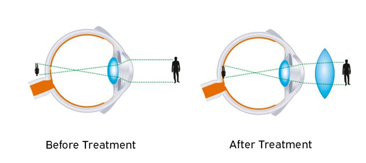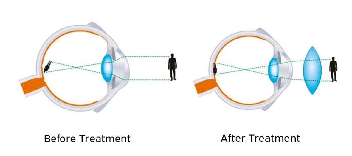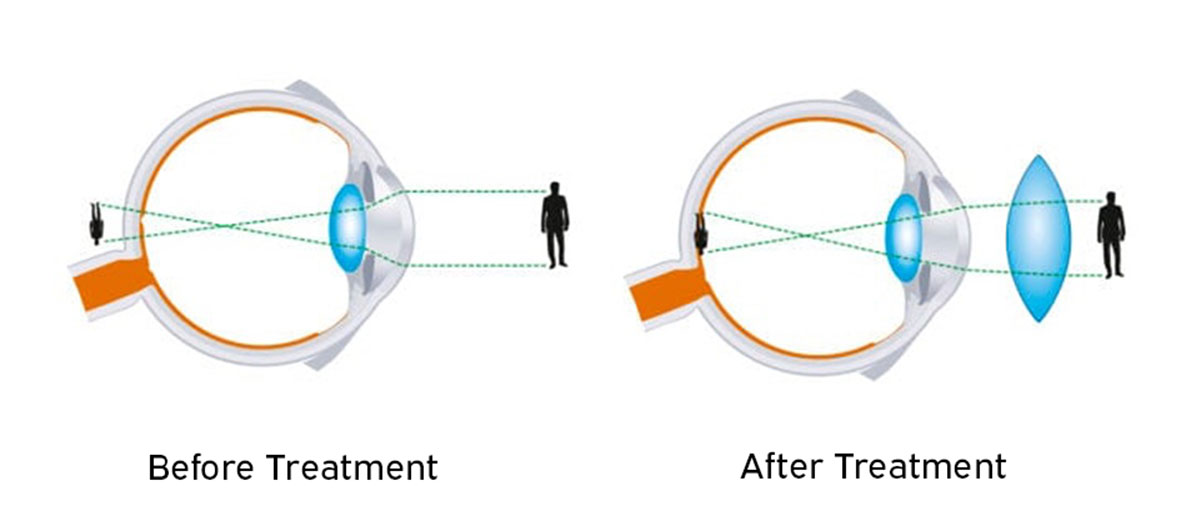 The ophthalmologist uses a laser to change the shape of your cornea. This laser eye surgery improves the way light rays are focused on the retina. LASIK is used to treat myopia (nearsightedness), hyperopia (farsightedness) and astigmatism.