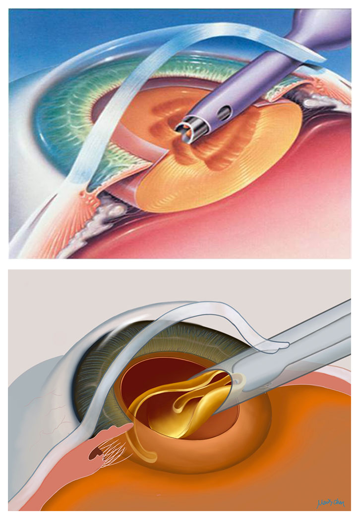 - Cataractous lens is broken down into small fragments and sucked out of the eye.